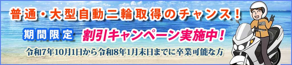 期間内に普通・大型自動二輪免許の取得をお考えの方、大変お得な割引料金となっています。詳細は最新情報のページへ